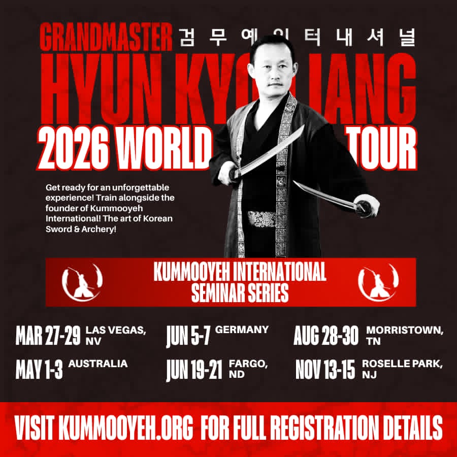 Kummooyeh schools around the world are hosting Grandmaster Jang so students and instructors can advance their knowledge of the expanding Kummooyeh International curriculum in sword and archery.